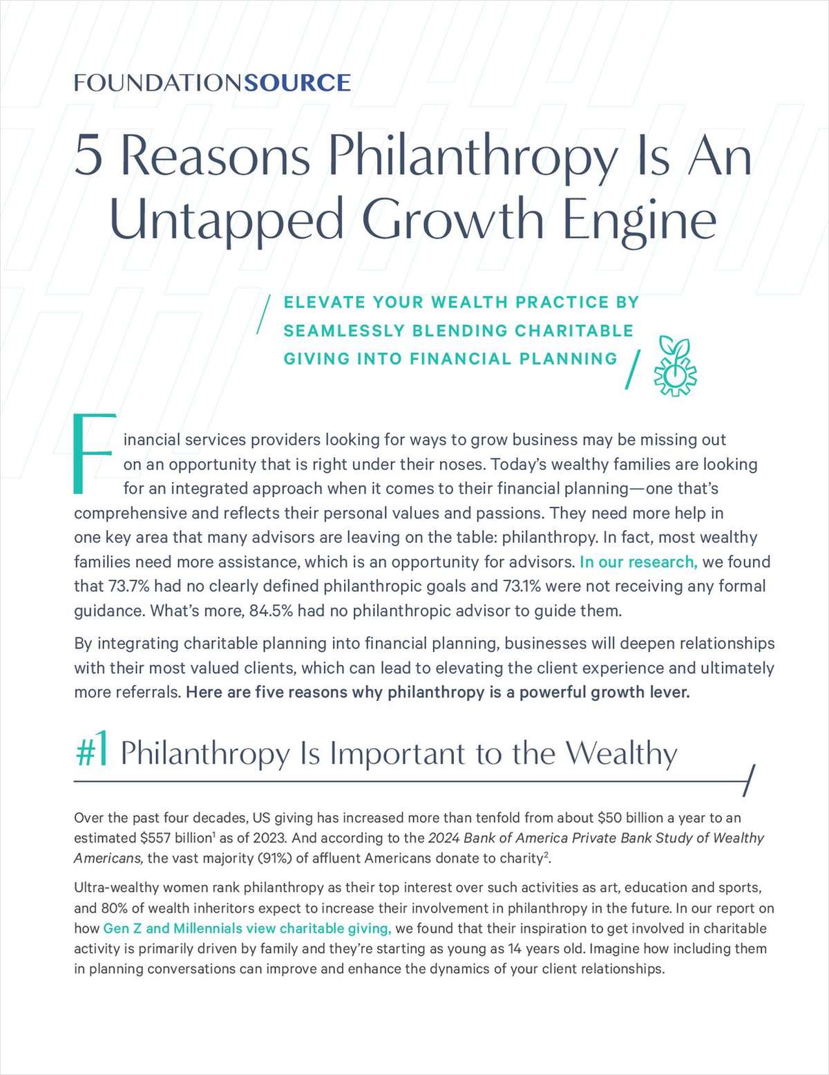 High-net-worth clients are looking for more than just wealth management–they want to create a lasting impact. Yet, most advisors overlook philanthropy as a strategic tool. Learn how integrating charitable planning can deepen relationships, increase referrals, and provide holistic financial solutions. Discover five reasons why philanthropy is a powerful yet underutilized growth engine for your practice.