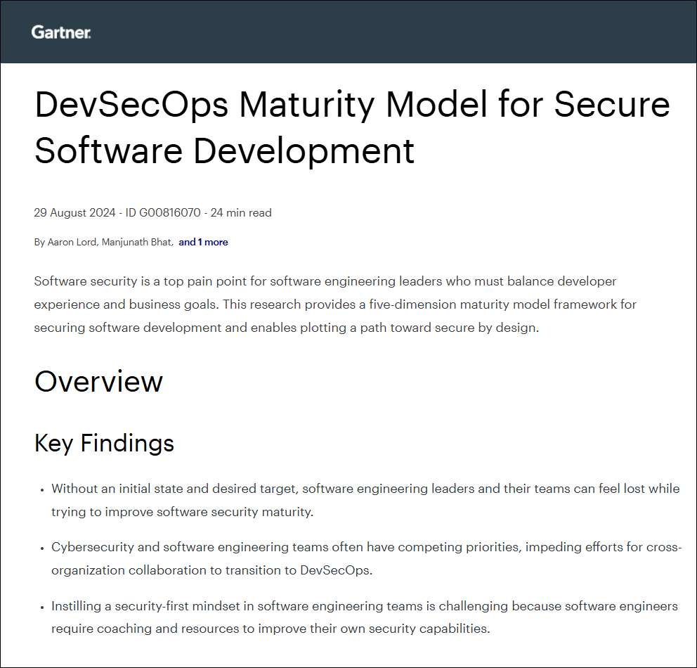 Gartner, DevSecOps Maturity Model for Secure Software Development, Aaron Lord, Manjunath Bhat, Aaron Harrison, 29 August 2024