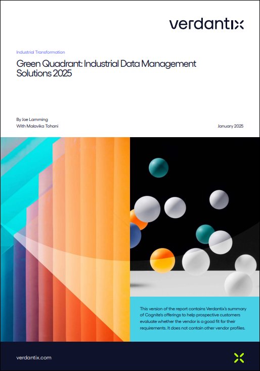 Cognite is honored to be selected as a leader in the Verdantix Green Quadrant: Industrial Data Management Solutions 2025 for providing a market-leading DataOps and AI platform for enterprise-scale, complex industrial data management projects.