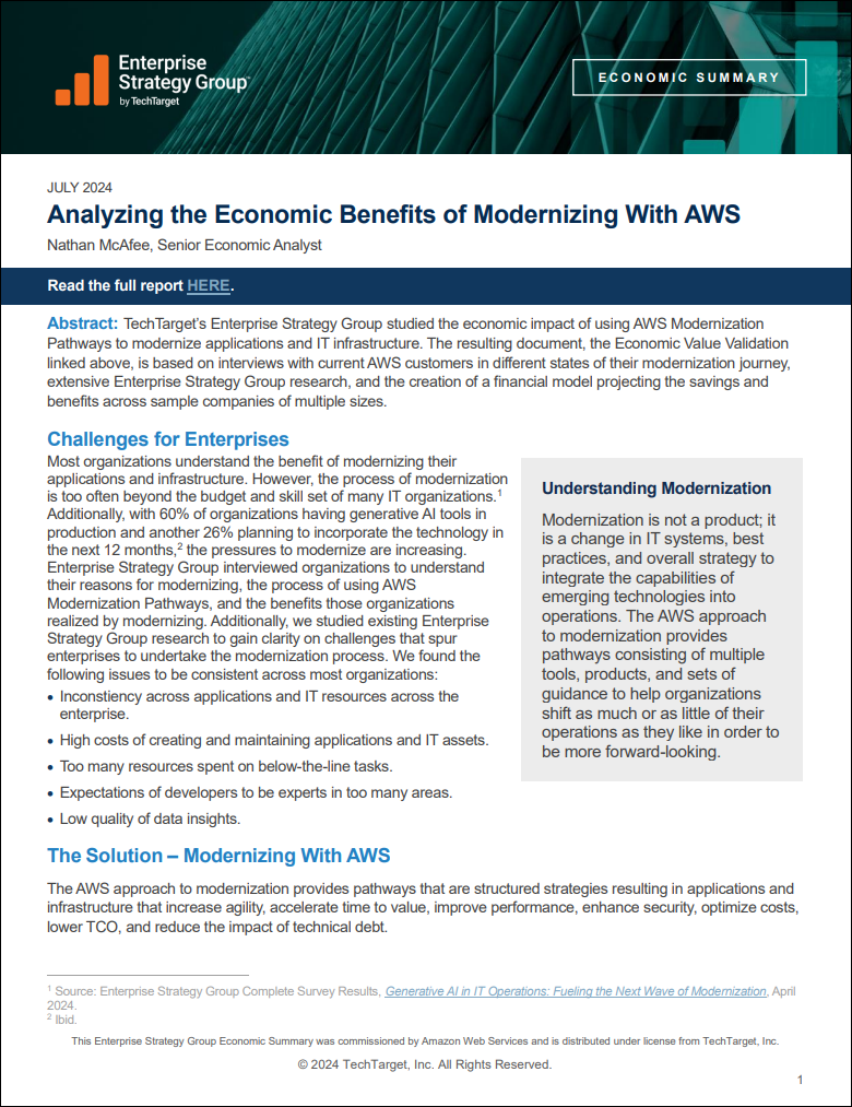Most organizations understand the benefit of modernizing their applications and infrastructure. However, the process of modernization is too often beyond the budget and skill set of many IT organizations. Additionally, with 60% of organizations having generative AI tools in production and another 26% planning to incorporate the technology in the next 12 months, the pressures to modernize are increasing. Enterprise Strategy Group interviewed organizations to understand their reasons for modernizing, the process of using AWS Modernization Pathways, and the benefits those organizations realized by modernizing.