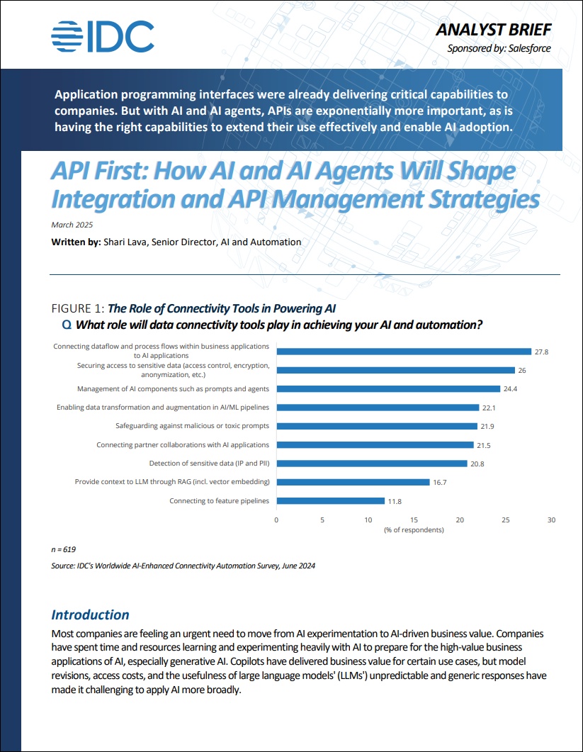 APIs were already delivering critical capabilities to companies. But with AI and AI agents, APIs are exponentially more important, as is having the right capabilities to extend their use effectively and enable AI adoption. This IDC Analyst Brief highlights the importance of rethinking the organizational approach and strategies for Integration & API Management to be better prepared to unlock the full potential of AI across your organization.
