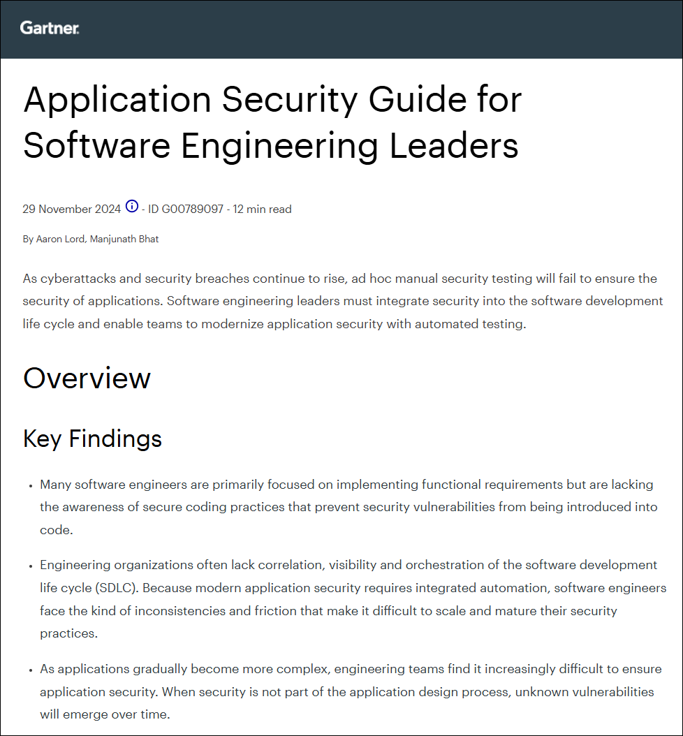 Gartner, Application Security Guide for Software Engineering Leaders By Aaron Lord, Manjunath Bhat, 29 November 2024