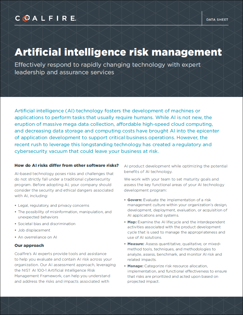 Artificial intelligence (AI) technology fosters the development of machines or applications to perform tasks that usually require humans. While AI is not new, the eruption of massive mega data collection, affordable high-speed cloud computing, and decreasing data storage and computing costs have brought AI into the epicenter of application development to support critical business operations. However, the recent rush to leverage this longstanding technology has created a regulatory and cybersecurity vacuum that could leave your business at risk.