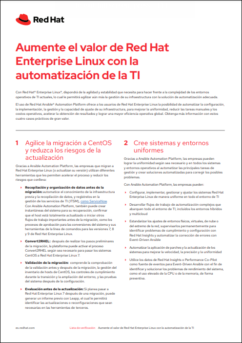 Utilizar Red Hat® Ansible® Automation Platform permite a los usuarios de Red Hat Enterprise Linux® automatizar la configuración, la implementación, la gestión y el ajuste de capacidad de la infraestructura. La automatización de Red Hat Enterprise Linux ofrece ventajas como la mejora de la uniformidad, la reducción de los esfuerzos manuales y de los costos operativos, una rentabilidad más rápida y una mayor eficacia operativa.