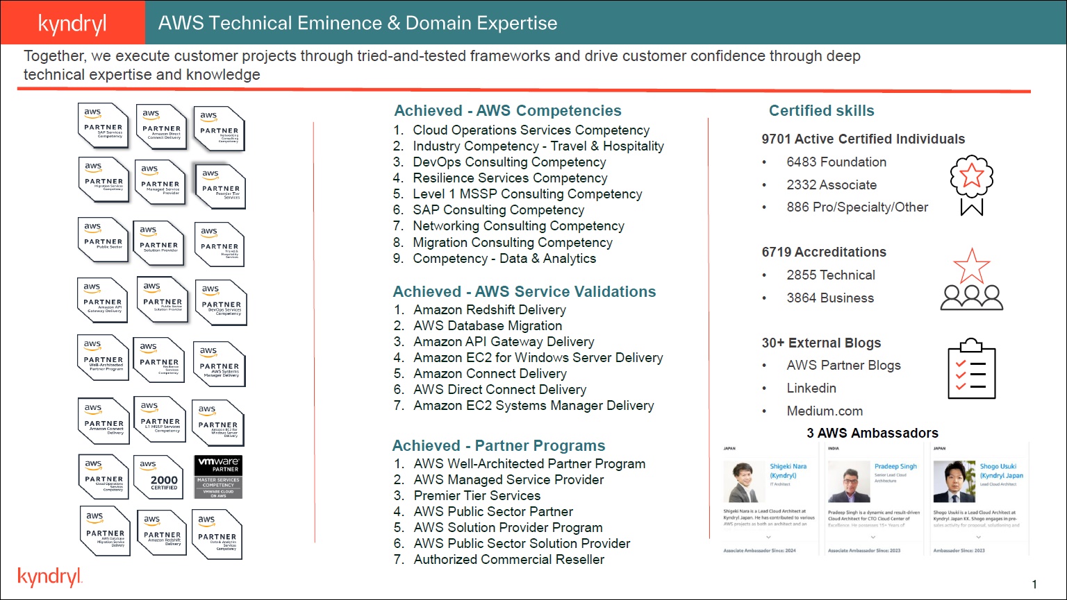 Kyndryl and AWS together, execute customer projects through tried-and-tested frameworks and drive customer confidence through deep technical expertise and knowledge.