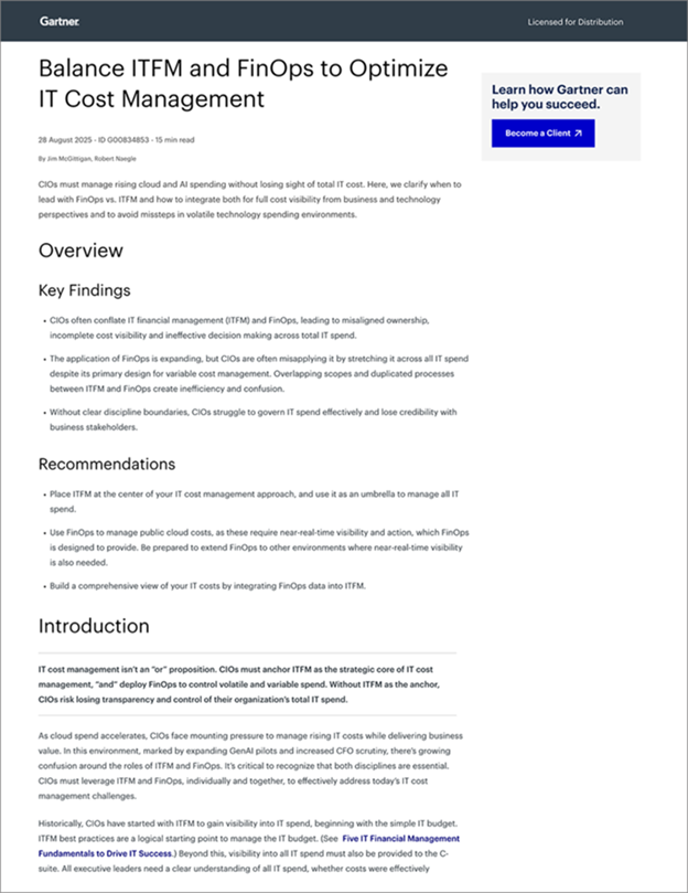 Gartner, Balance ITFM and FinOps to Optimize IT Cost Management, Jim McGittigan, Robert Naegle, 28 August 2025