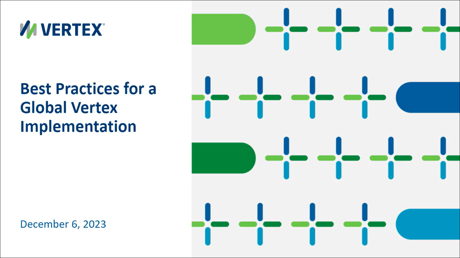 In this session, we will discuss the best practices for planning, executing, and supporting Global Vertex Implementations. We will also discuss how to best implement a support strategy to maximize ROI on a go-forward basis, so you get the most out of Vertex.