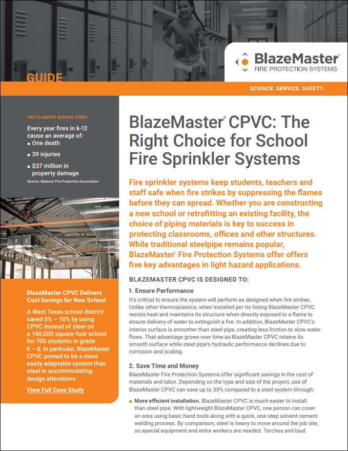 Learn how BlazeMaster CPVC provides dependable protection for students, faculty and staff while saving time and money on installation, reducing maintenance costs, limiting disruption during retrofits, and supporting green building practices.