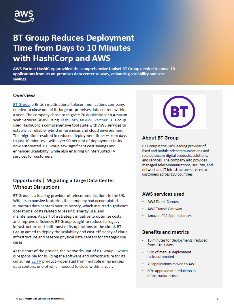 AWS Partner HashiCorp provided the comprehensive toolset BT Group needed to move 70 applications from its on-premises data center to AWS, enhancing scalability and cost savings.