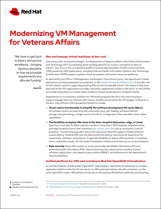 Red Hat OpenShift Virtualization is an application platform that could allow the VA to run virtual machine (VM) workloads alongside containers on the same OpenShift nodes.