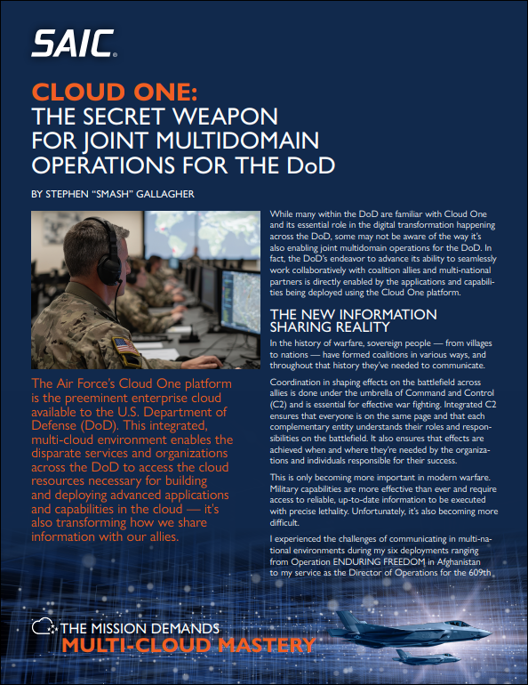 Stephen “Smash” Gallagher of SAIC explores how the Cloud One platform is enabling mission-critical capabilities. This includes the applications enabling the DoD to share information and seamlessly collaborate with its allies and coalition partners.