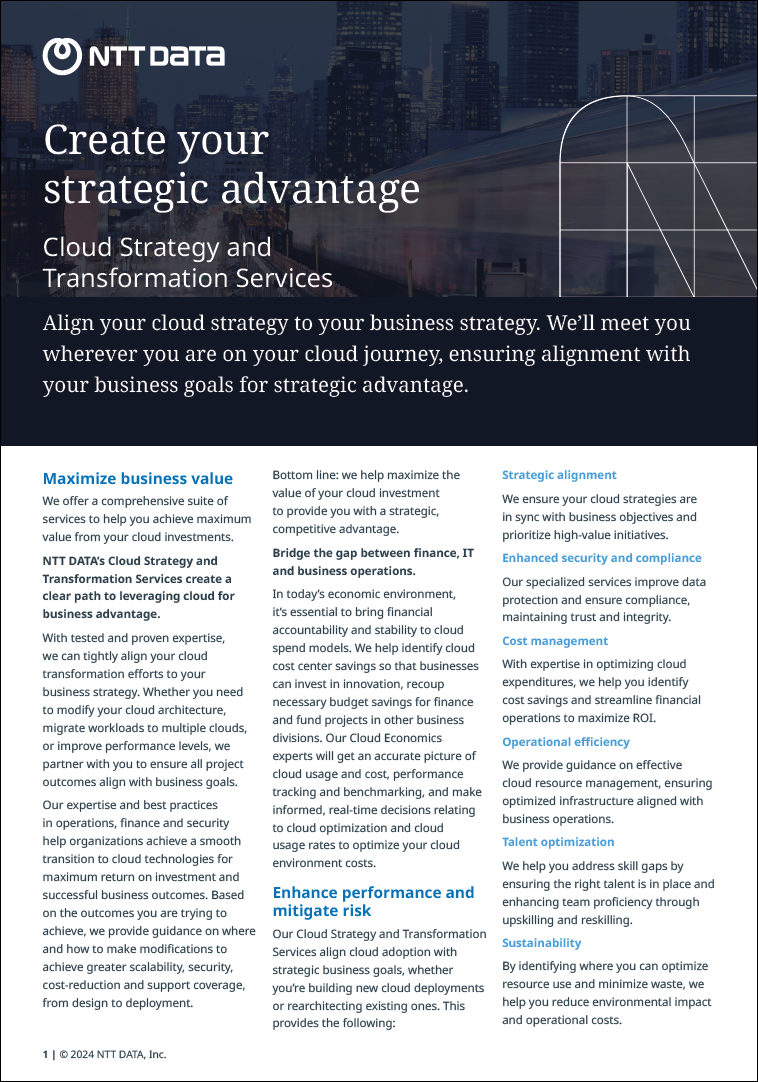 Transform your business with NTT DATA’s tailored cloud strategies that guarantee alignment with your business objectives. Discover the pathway to:
