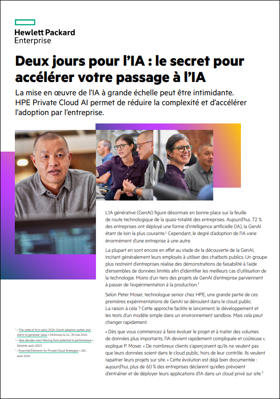 Pour réussir le déploiement de l’IA (en particulier l’IA générative), il importe d’aller vite. Vous pouvez aisément perdre des mois à mettre en place votre infrastructure et à monter lentement en charge. Avec HPE Private Cloud AI, les clients peuvent emprunter la voie rapide pour déployer l’IA de manière rapide et simple grâce à la solution d’IA clés en main unique en son genre de HPE. Découvrez comment le partenariat entre HPE et NVIDIA sous-tend cette technologie, et explorez les nombreux avantages de HPE Private Cloud AI.