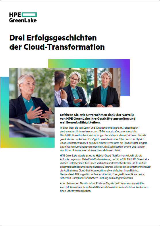 In einer Welt, die von Daten und KI angetrieben wird, erwarten Unternehmens- und IT-Führungskräfte zunehmend die Flexibilität, überall sichere Verbindungen herstellen und einen sicheren Betrieb gewährleisten zu können. Dies wird durch die Leistungsfähigkeit der Hybrid Cloud zunehmend möglich. Erfahren Sie, wie drei Unternehmen mithilfe von HPE GreenLake, der Hybrid-Cloud-Plattform von HPE, ihren Geschäftsbetrieb transformieren und ihrer Konkurrenz einen Schritt voraus bleiben.