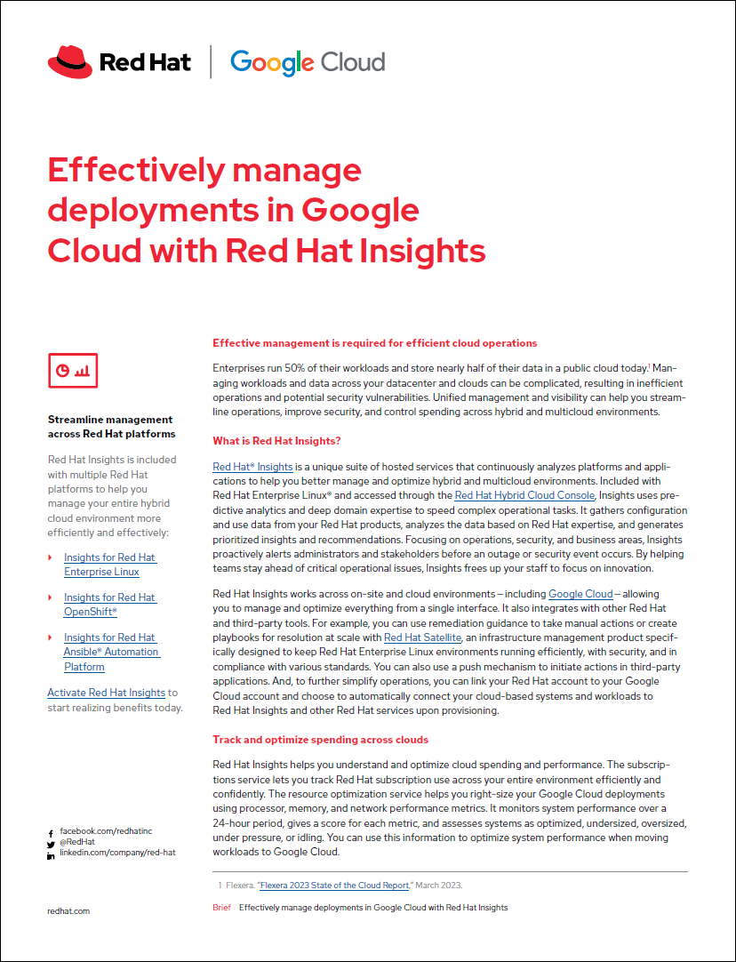 Read this brief to understand how Red Hat Insights helps you better manage and optimize Red Hat deployments in Google Cloud environments.