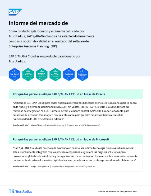 Y esto es exactamente de lo que trata el informe de mercado de TrustRadius: de revelar la buena noticia de que el 99 % de los clientes volverían a comprar SAP® S/4HANA® Cloud.Así que si estás buscando una solución ERP en la nube, este informe es un muy buen punto de partida.