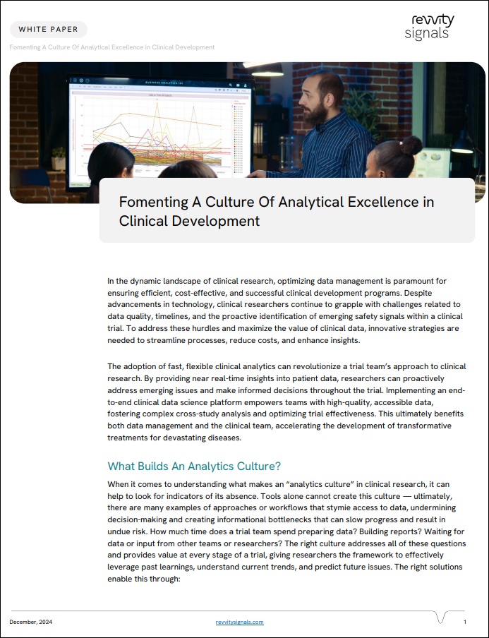 Establishing a robust analytics culture is essential for optimizing clinical research and driving data-driven decision-making. By creating an environment where data is accessible, utilized effectively, and integrated into daily workflows, organizations can unlock valuable insights and improve outcomes.  Understand how creating a culture of analytical excellence in clinical development can help your organization optimize processes, improve decision-making, and accelerate the development of innovative therapies.
