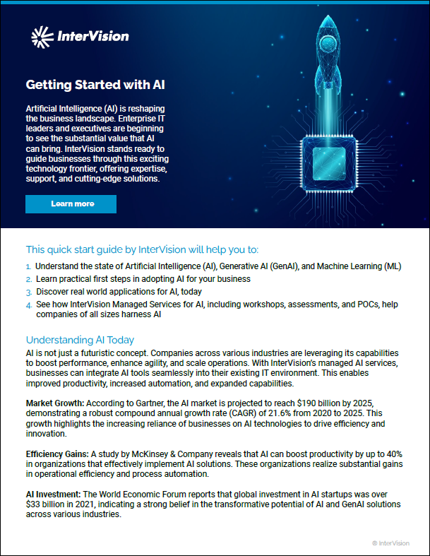 Download this guide to discover how InterVision can help you gain insights into the current landscape of Artificial Intelligence (AI), Generative AI (GenAI), and Machine Learning (ML).