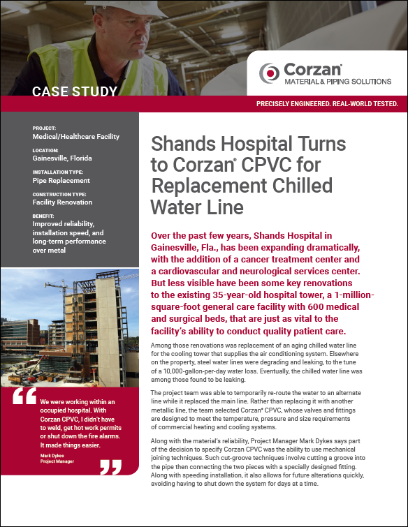 As Shands Hospital expanded its specialized care centers, it also faced critical infrastructure challenges in its original 35-year-old tower. This case study explores how the facility overcame major water line failures and cooling system inefficiencies by choosing Corzan® CPVC piping.