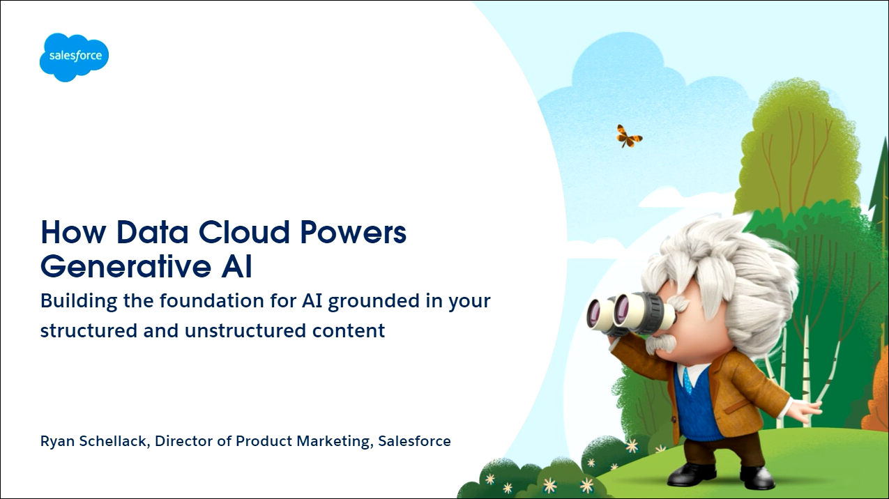 Join product experts from Salesforce as they explore how structured and unstructured data is being used to fuel relevant AI. We’ll explore patterns for zero-copy integration, grounding prompts with Data Cloud data, vector databases, and how to build a data foundation for AI, automation, and analytics. You’ll see roadmap material, live demos, and walk away with a strategy for AI powered by your data in Data Cloud.