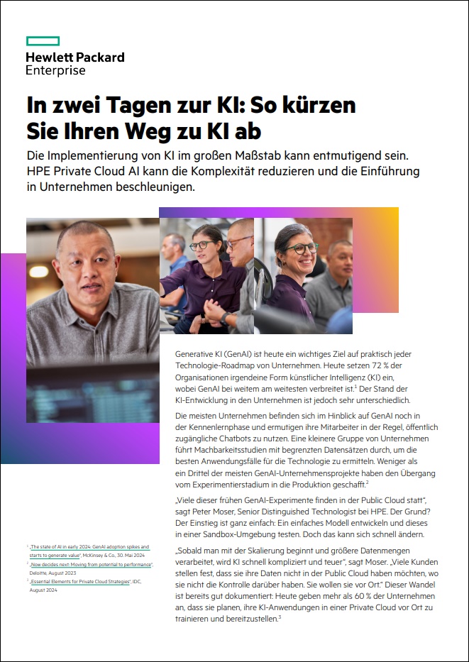 Um mit KI (insbesondere GenAI) erfolgreich zu sein, müssen Sie schnell sein. Es können leicht Monate vergehen, bis die Infrastruktur eingerichtet ist und langsam auf Touren kommt. Mit HPE Private Cloud AI haben Sie die Chance auf eine Abkürzung: eine schnelle und einfache Möglichkeit zur KI-Einführung dank der ersten, sofort nutzbaren KI-Lösung ihrer Art von HPE. Erfahren Sie, wie die Partnerschaft zwischen HPE und NVIDIA diese Technologie vorantreibt, und entdecken Sie die zahlreichen Vorteile von HPE Private Cloud AI.