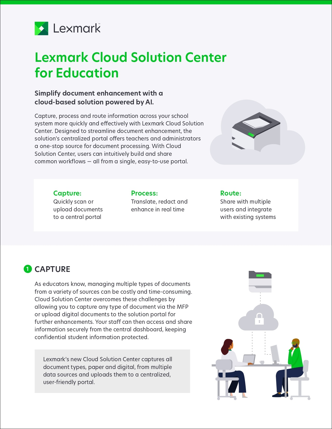 Capture, process and route information across your school system more quickly and effectively with Lexmark Cloud Solution Center. Designed to streamline document enhancement, the solution’s centralized portal offers teachers and administrators a one-stop source for document processing. With Cloud Solution Center, users can intuitively build and share common workflows — all from a single, easy-to-use portal.