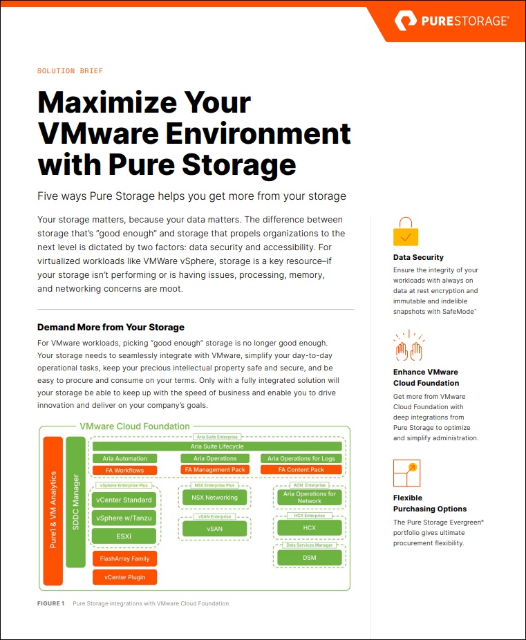 Download the solution brief to discover how Pure Storage supercharges your VMware environment with unmatched performance, security, and simplicity.