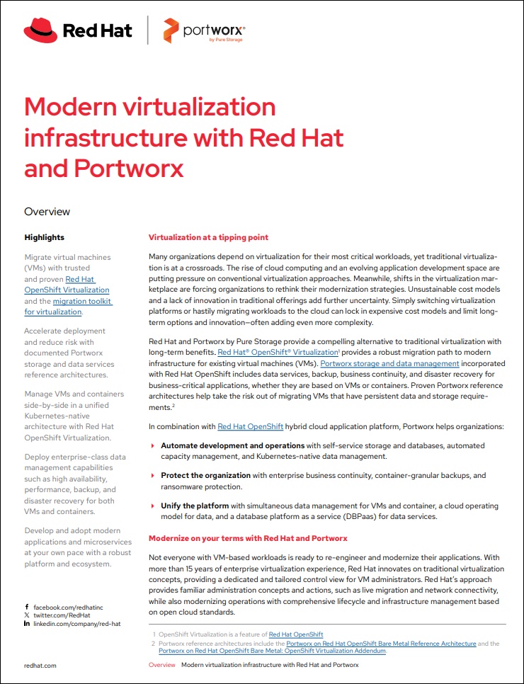 Download this brief to learn how to build a smarter virtualization strategy and learn through workshops, assess your VM landscape, and establish a solid foundation with Red Hat and Portworx.