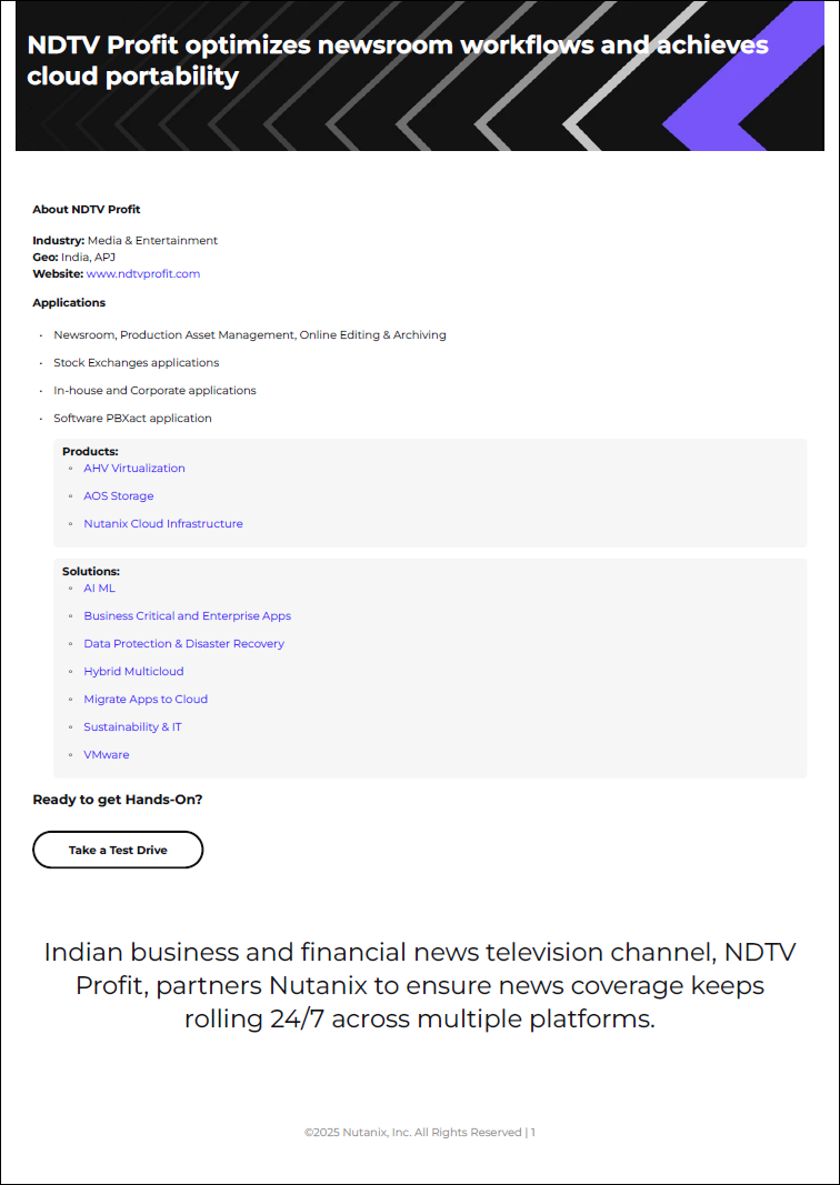 Download to learn more about how NDTV Profit optimized newsroom workflows, achieved cloud portability, improved resiliency, cut costs by 60%, and built a foundation for AI adoption with Nutanix.