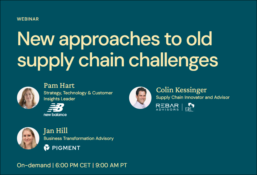 Watch this exclusive panel discussion featuring industry leaders Colin Kessinger, formerly Managing Director at End to End Analytics, Pam Hart, SVP Strategy, Insights & Technology at New Balance, and Jan Hill, GTM Strategy & Industry Solutions Lead at Pigment.