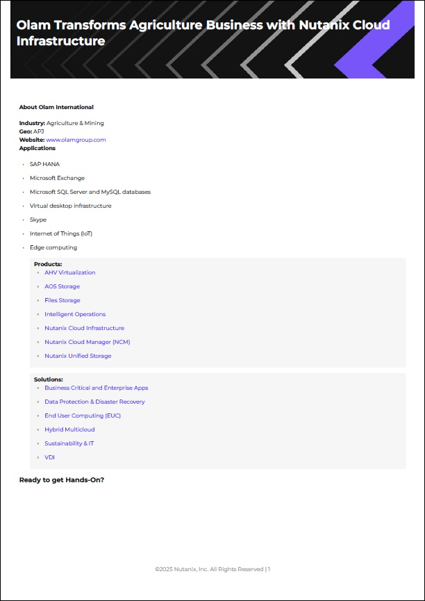 To create safer, more efficient and sustainable ways of operating, Olam chose a Nutanix Cloud Infrastructure, unifying management across hybrid clouds and gaining the performance and reliability for its mission-critical workloads. The company, which has successfully scaled the platform to support 95 percent of applications, is now driving its end-to-end digital transformation strategy using Nutanix.