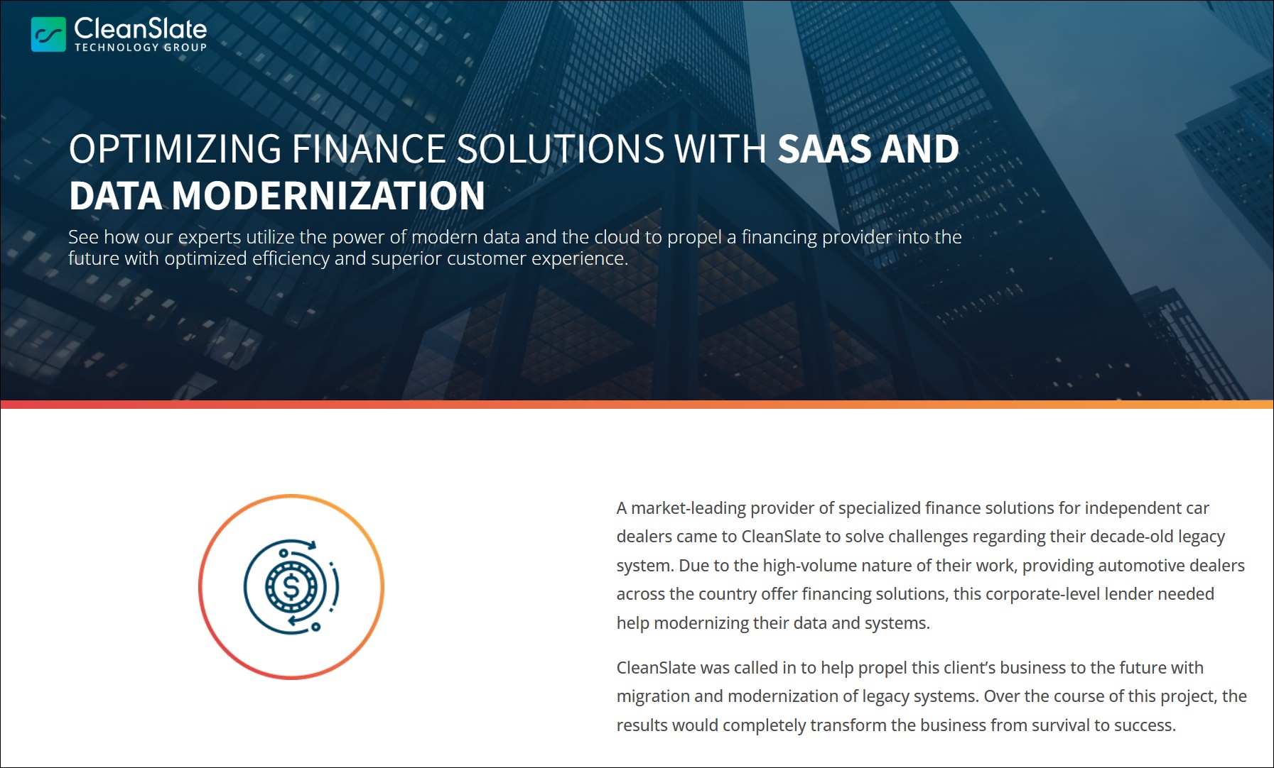 A market-leading provider of specialized finance solutions for independent car dealers came to CleanSlate to solve challenges regarding their decade-old legacy system. Due to the high-volume nature of their work, providing automotive dealers across the country offer financing solutions, this corporate-level lender needed help modernizing their data and systems.