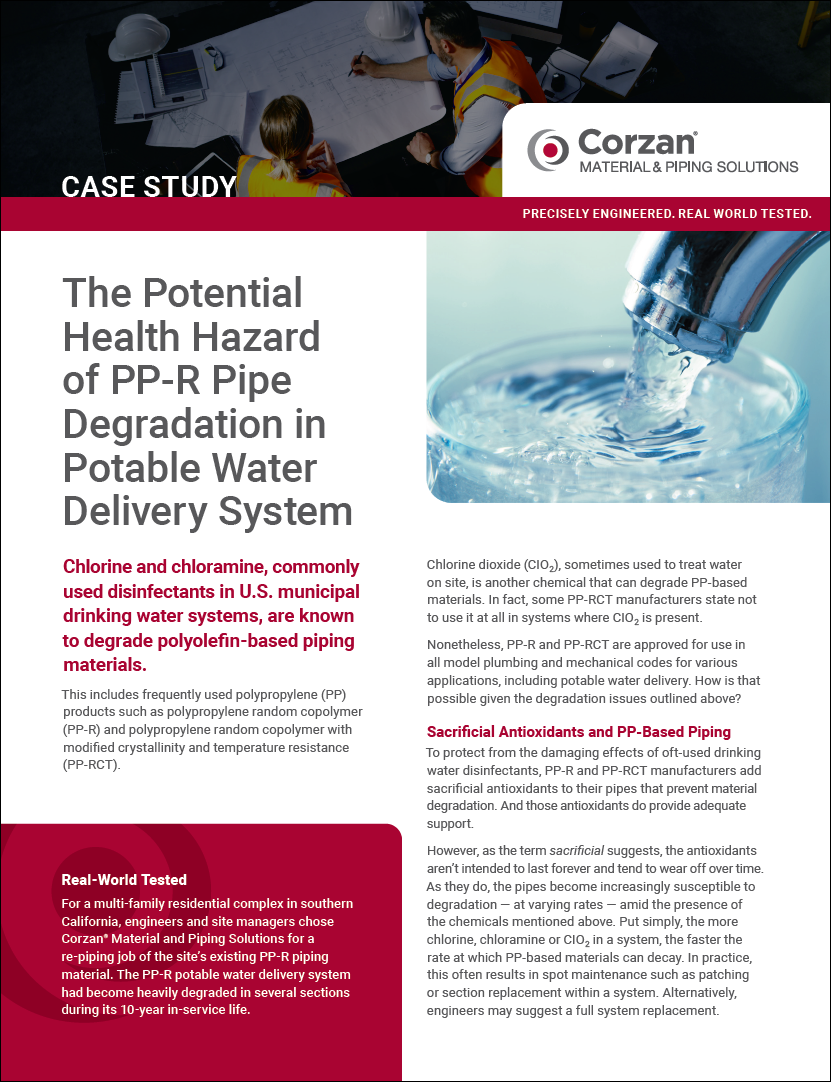 This case study explores a real-world re-piping project at a Southern California residential complex, where PP-R piping degraded after 10 years of service. Engineers replaced the system with Corzan® CPVC, prompting a deeper investigation into the failure.