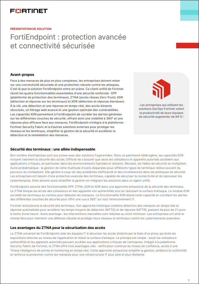 Le triptyque ZTNA, EDR et XDR se révèle essentiel pour protéger les réseaux et les terminaux de l’entreprise. Grâce à toutes ces capacités, FortiEndpoint garantit à la fois une sécurité robuste et des accès distants ultra fluides. Ce n’est pas tout. Le monitoring continu, la détection basée sur les omportements et la réponse automatisée améliorent l’efficacité des SecOps, réduisant ainsi le MTTD et le MTTR. Les entreprises bénéficient également d’un catalogue complet d’intégrations aux solutions Fortinet et d’autres fournisseurs, garant d’une infrastructure de sécurité unifiée, où les données de Threat Intelligence sont partagées en temps réel et les politiques appliquées de façon dynamique. Grâce aux solutions intégrées de Fortinet, FortiEndpoint en tête, les équipes IT peuvent déployer un framework de cybersécurité robuste et scalable pour protéger leurs assets les plus précieux et garantir la continuité des activités en cas d’attaque.