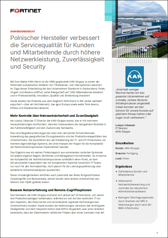 Als bei der KAN Group die IT- und OT-Umgebungen konvergiert wurden, nutzte man die Gelegenheit für umfassende Netzwerk- und Sicherheitsverbesserungen. Nach einer Marktbewertung implementierte das Unternehmen mit Fortinet Secure SD-WAN eine einheitliche Netzwerk- und Security-Infrastruktur. Das Ergebnis: mehr Effizienz mit umfassener Transparenz und Kontrolle, insbesondere über Niederlassungen und Remote-Anwender. Die Fortinet-Lösungen für Netzwerksicherheit, ortsunabhängiges Arbeiten (WFA) und Security Operations sind über die Fortinet Security Fabric konsolidiert. Management und Automatisierung sind so integiert – und alles wird durch externe Bedrohungsinformationen von den FortiGuard Labs geschützt.