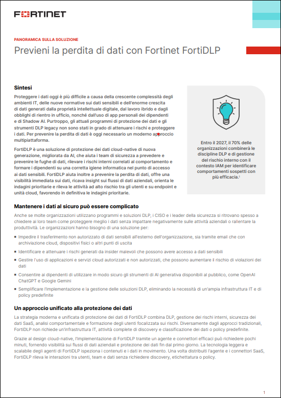 FortiDLP è una soluzione di protezione dei dati cloud-native di nuova generazione, migliorata da AI, che aiuta i team di sicurezza a prevedere e prevenire le fughe di dati, rilevare i rischi interni correlati al comportamento e formare i dipendenti su una corretta igiene informatica nel punto di accesso ai dati sensibili. FortiDLP aiuta inoltre a prevenire la perdita di dati, offre una visibilità immediata sui dati, ricava insight sui flussi di dati aziendali, orienta le indagini prioritarie e rileva le attività ad alto rischio tra gli utenti e su endpoint e unità cloud, favorendo in definitiva le indagini prioritarie.