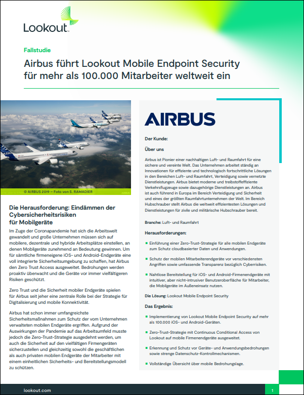 Diese Fallstudie zeigt, wie Airbus eine Zero-Trust-Strategie umgesetzt hat, um mehr als 100.000 iOS- und Android-Unternehmensgeräte proaktiv vor Bedrohungen zu überwachen und gleichzeitig vor einem ständig wachsenden Spektrum an Risiken zu schützen.
