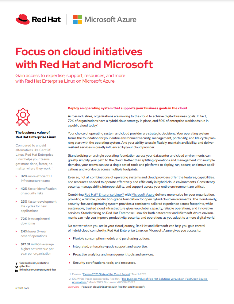 Across industries, organizations are moving to the cloud to achieve digital business goals. No matter where you are in your cloud journey, Red Hat and Microsoft can help you gain control of hybrid cloud complexity. Running Red Hat® Enterprise Linux® on Microsoft Azure gives you a consistent, manageable, and security-focused foundation for getting the most value from your cloud investments.