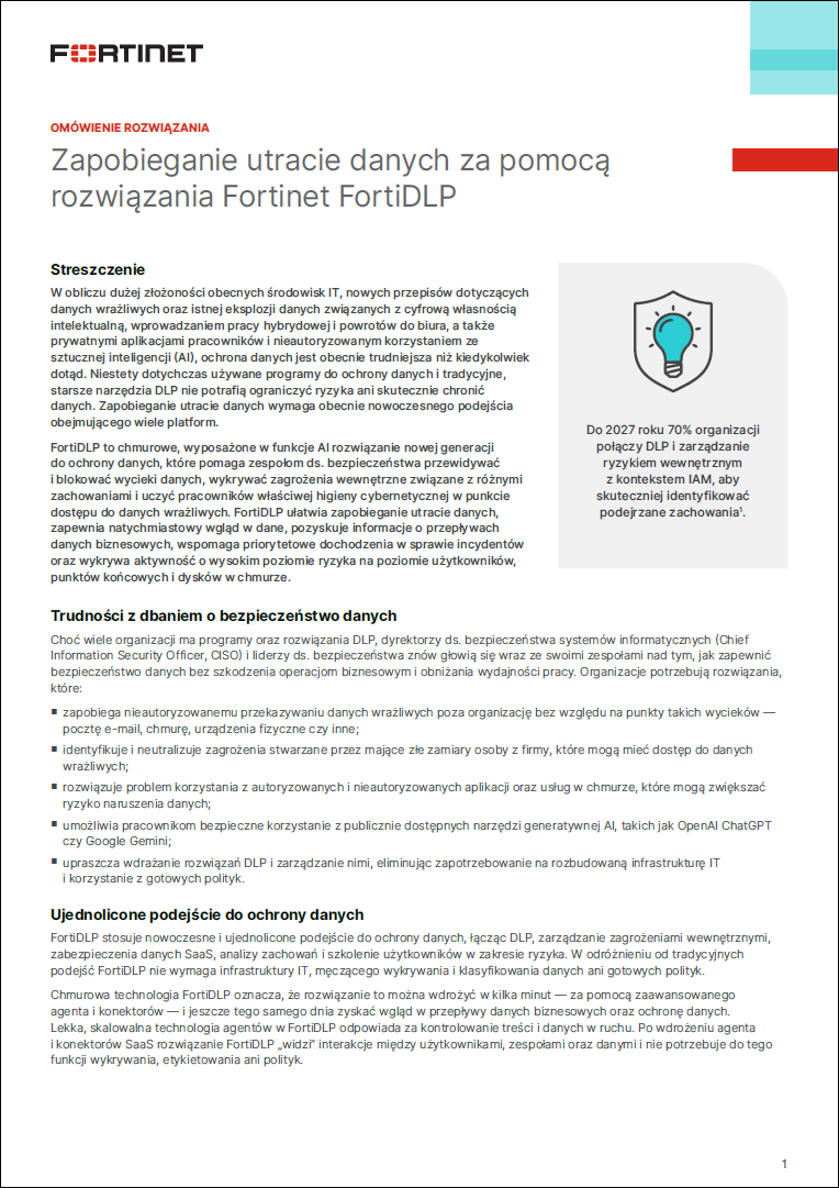 FortiDLP to chmurowe, wyposażone w funkcje AI rozwiązanie nowej generacji do ochrony danych, które pomaga zespołom ds. bezpieczeństwa przewidywać i blokować wycieki danych, wykrywać zagrożenia wewnętrzne związane z różnymi zachowaniami i uczyć pracowników właściwej higieny cybernetycznej w punkcie dostępu do danych wrażliwych. FortiDLP ułatwia zapobieganie utracie danych, zapewnia natychmiastowy wgląd w dane, pozyskuje informacje o przepływach danych biznesowych, wspomaga priorytetowe dochodzenia w sprawie incydentów oraz wykrywa aktywność o wysokim poziomie ryzyka na poziomie użytkowników, punktów końcowych i dysków w chmurze.