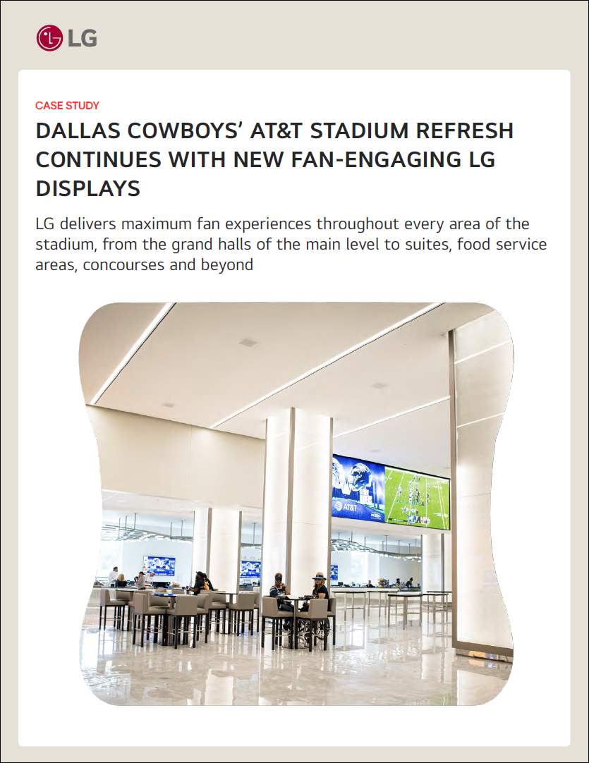 At AT&T Stadium, delivering a high-quality visitor experience is key to building fan loyalty, encouraging repeat attendance, and optimizing food and beverage performance. These priorities guided the latest refresh, which includes new display solutions from LG. This follows a major upgrade in 2021, which included approximately 1,000 new commercial-grade LG 4K LCD displays, as well as vibrant and immersive LG MAGNIT LED displays.