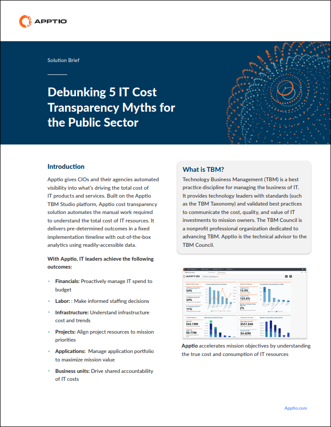 For agencies and mission owners reluctant to start an IT spending transparency initiative, this brief separates myths from reality in using Technology Business Management (TBM) to run IT like a business. Leverage tried-and-true standard industry principles to gain full visibility, increased accountability, and better understanding of how your strategic technology investments drive key mission objectives.