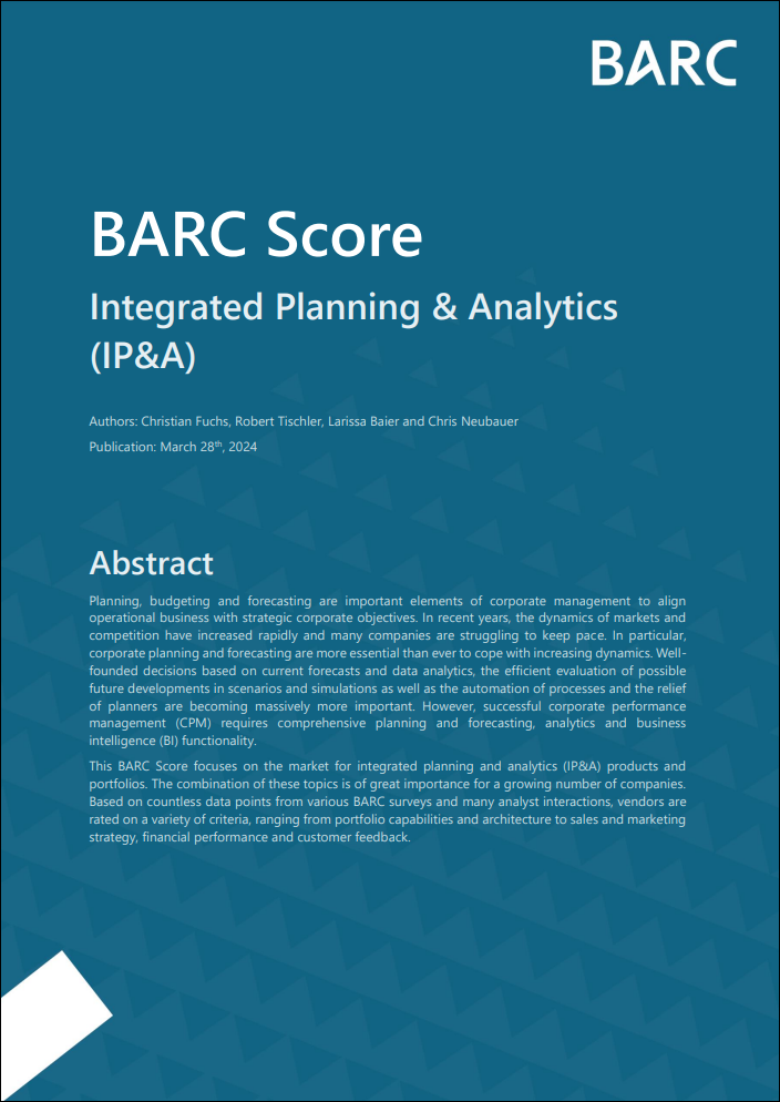 This 2024 BARC Score report emphasises integrated planning and analytics’ crucial role in modern corporate management. It evaluates 14 leading software vendors based on 15 criteria, including functionality, architecture, and financial performance, with the goal of helping your organisation to select the most appropriate solution.