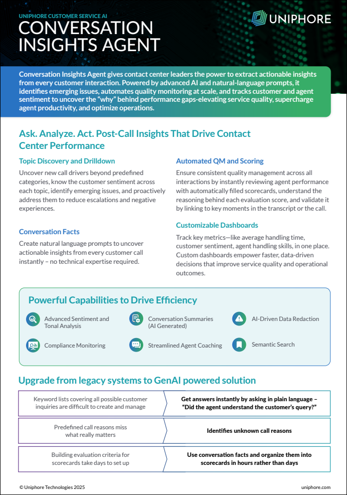 Conversation Insights Agent gives contact center leaders the power to extract actionable insights from every customer interaction. Powered by advanced AI and natural-language prompts, it identifies emerging issues, automates quality monitoring at scale, and tracks customer and agent sentiment to uncover the “why” behind performance gaps-elevating service quality, supercharge agent productivity, and optimize operations.