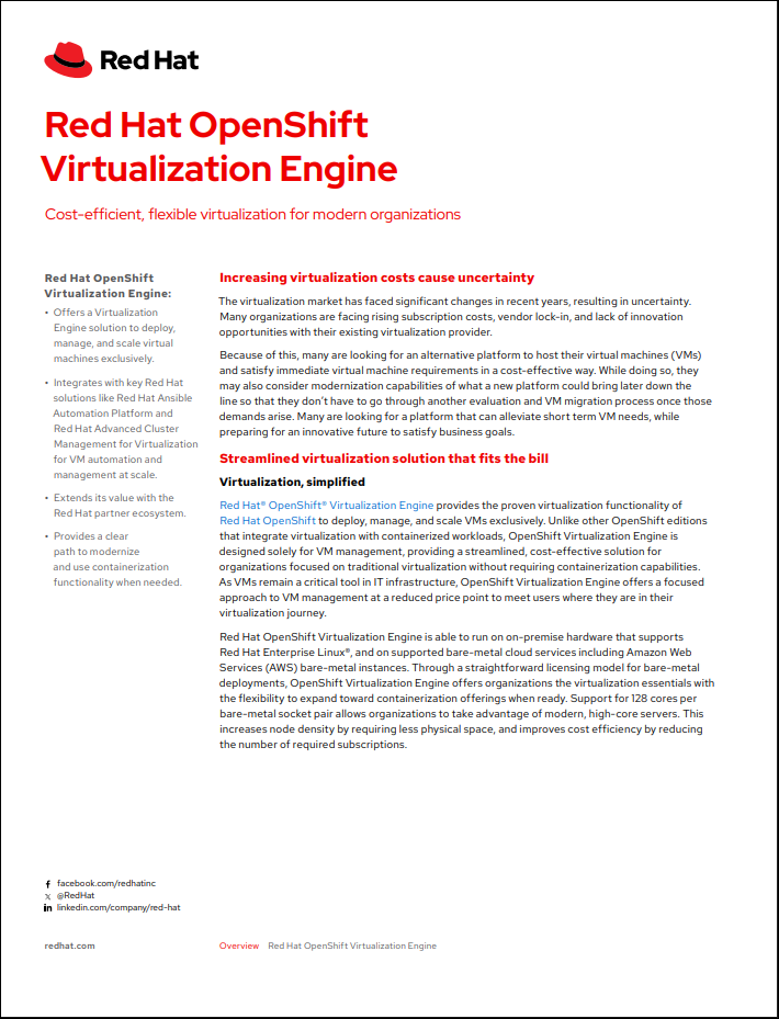 Red Hat OpenShift Virtualization Engine can deploy, manage, and scale VMs exclusively. Download to read more.