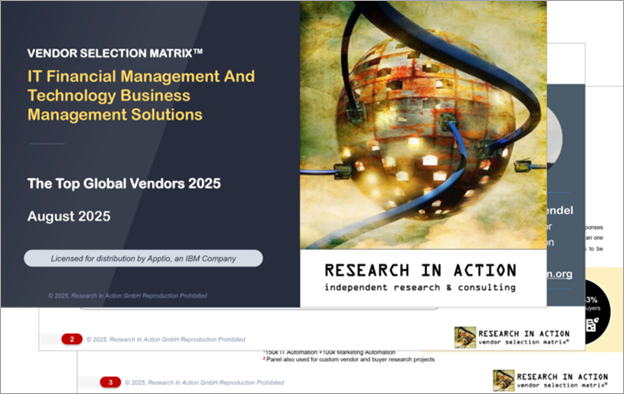 Apptio has been named the leader among ITFM and TBM solutions by Research in Action’s 2025 Vendor Selection Matrix™ report, a survey-based evaluation of a thousand IT and business leaders.