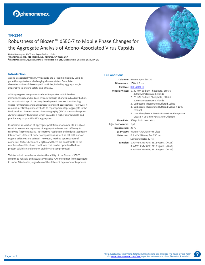 Biozen dSEC-7 proves instrumental in quickly and accurately resolving AAV monomer from aggregates in under 10 minutes, showcasing consistent results across different mobile phase conditions. With a 700 Å pore size and patented hydrophilic diol-type surface chemistry, this SEC column ensures excellent resolution and recovery for AAV serotypes 5, 8, and 9. This flexible approach to method development offers a reliable and reproducible solution for AAV aggregate quantitation.