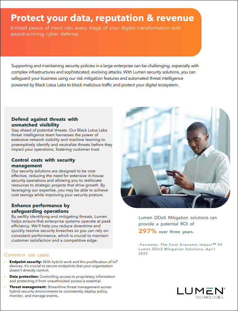 In today’s digital age, protecting your data, reputation, and revenue is more critical than ever. We understand the unique challenges you face, and we’re here to support you every step of the way. Our brief, “Protect your data, reputation & revenue” offers essential insights into how Lumen’s advanced security solutions can help you achieve this.