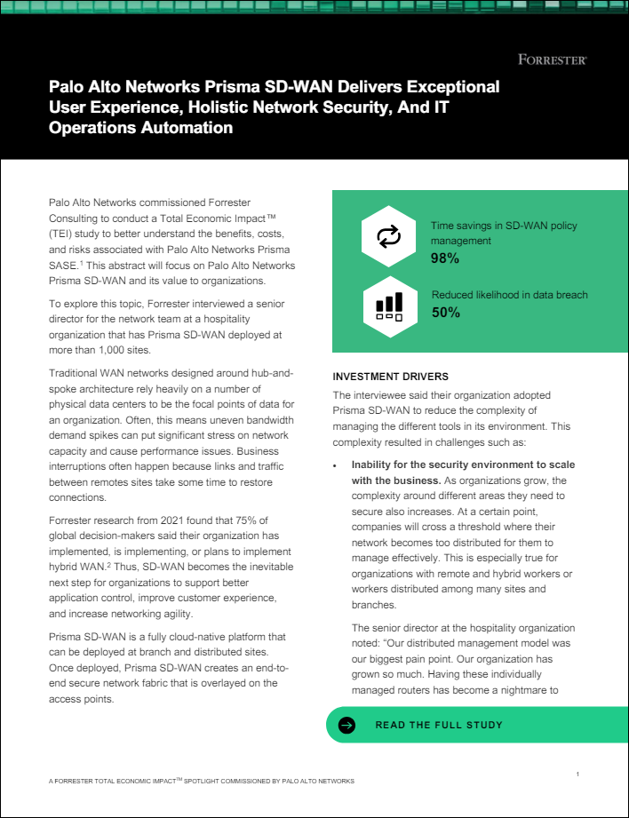 Palo Alto Networks commissioned Forrester Consulting to examine the potential return on investment organizations may achieve by deploying Prisma®️ SD-WAN. The December 2023 Total Economic Impact™️(TEI) Spotlight Of Palo Alto Networks Prisma SD-WAN offers guidance and illustrates its greatest benefits. Some key findings are: