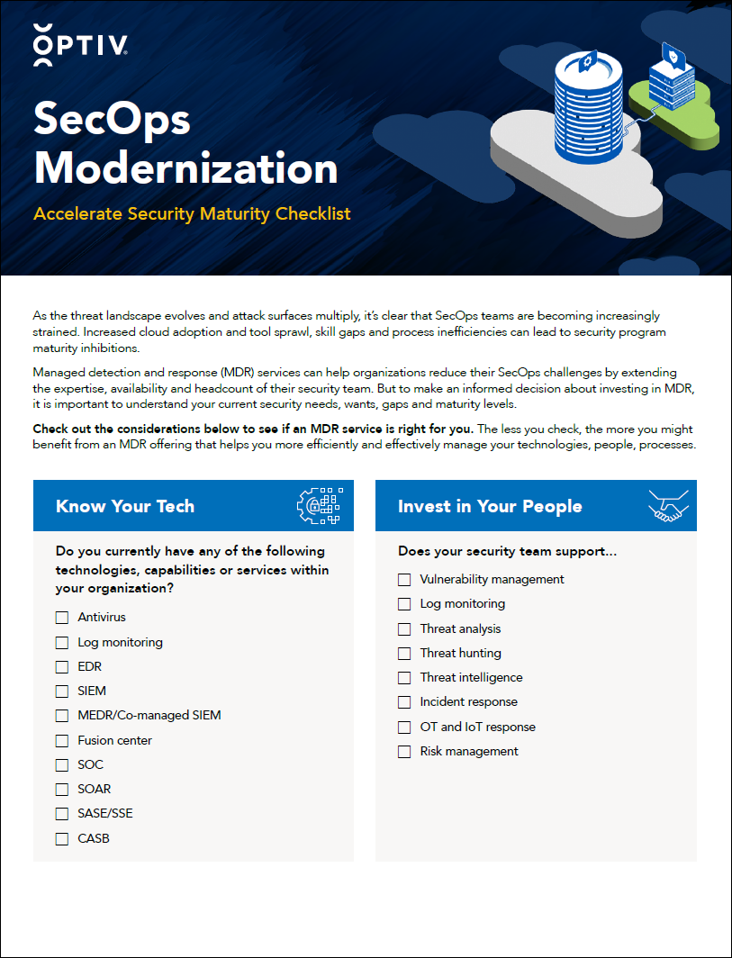 Download this checklist to learn more about MDR offering that helps you more efficiently and effectively manage your technologies, people, processes.