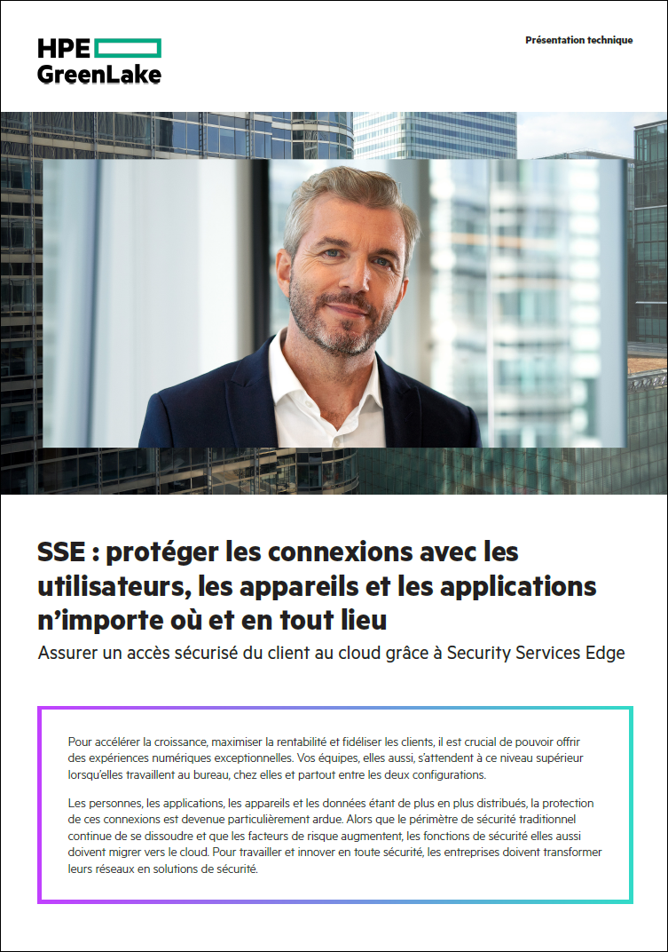 Le bureau d’aujourd’hui se trouve n’importe où. Les applications ont migré vers le cloud et inversement. Pour fournir des services de sécurité à grande échelle, de l’edge au cloud, les équipes informatiques ont besoin d’une nouvelle approche. Les solutions SD-WAN et Security Service Edge (SSE) constituent les premières étapes vers la mise en place d’une architecture Zero Trust et SASE (Secure Access Service Edge). Les solutions de mise en réseau sécurisée HPE Aruba vous offrent :